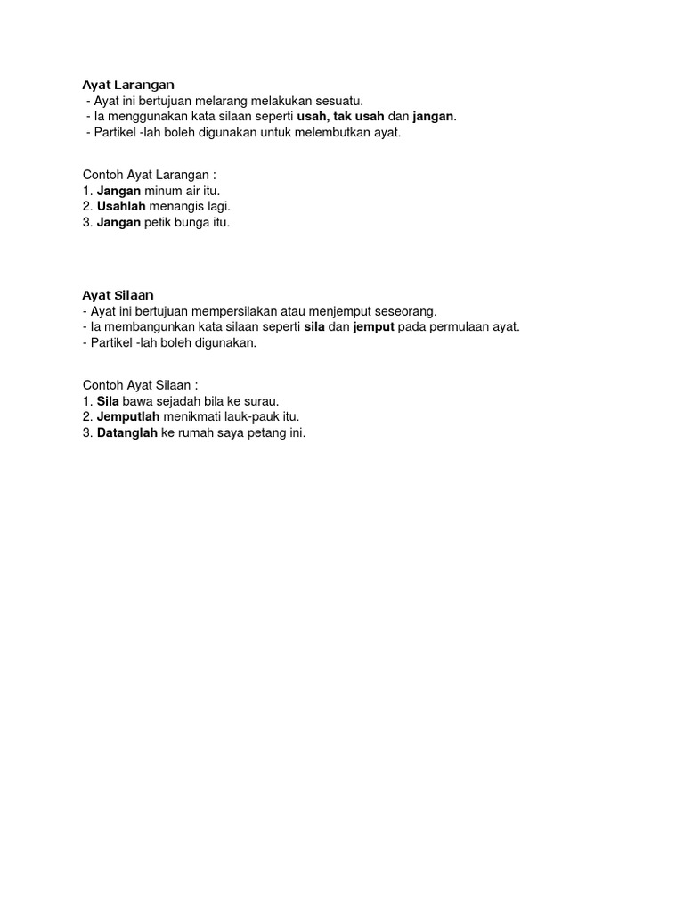 Bentuk ayat silaan dan permintaan tidak membawa pengertian yang negatif sebagaimana yang terdapat dalam jenis ayat larangan. Hantarkan kereta sekarang juga. Dan Allah tidak menyukai setiap orang yang tetap dalam.